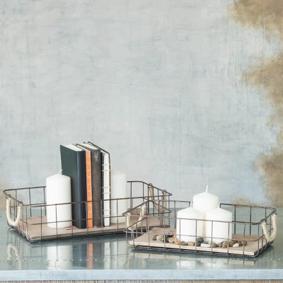 Bring a rustic feel to your home decor with Stonebriar’s 2pc rectangle rustic wood and metal basket set. Large basket measures 16.7″L x 10.2″W x 4″H. Small basket measures 14.7″L x 8.4″W x 4″D and can easily nest inside the larger basket. Each basket features a lightly distressed natural wood base with a rustic metal wire frame. The attached metal handles make it easy to carry the baskets from one room to the next. Add your favorite pillar candles and orbs to make a bright decorative table centerpiece. Baskets can also be used to create a rustic coffee or drink bar. Display your Stonebriar rustic wood and metal basket set by itself or mix and match with other Stonebriar decor accessories.