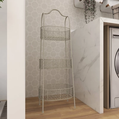 - This functional three tiered metal stand features 3 oval baskets with a mesh exterior design and a textured monotone metal finish