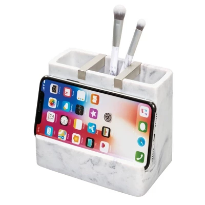 Organize your countertops with the iDESIGN Dakota Vanity Center! This white marble print organizer is constructed of durable resin for years of quality use. The four sections of the organizer are perfect for holding makeup brushes, toothbrushes, accessories, hair items, soap, and more. With metal details, the organizer will remain rust-free and effortlessly match any decor. The iDESIGN Dakota Vanity Center measures 5.25″ x 3.2″ x 4.06″, the perfect size for any space. With iDESIGN by InterDesign, you can #livesimply every day.
