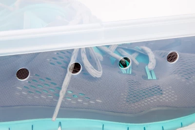Shoe-lovers rejoice. Organizing your shoe collection is easier than ever thanks to the Easy Access shoe box. Never dig through another pile of boxes again; this stackable design features a front-open panel that lifts and locks into place so you can access any box without disturbing the whole stack. Ultra-clear plastic lets you identify contents at a glance, with a generous size that fits most styles of men’s shoes up to a size 13, (depending on style). Ventilation holes on both sides allow air circulation.