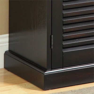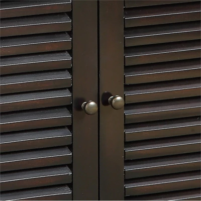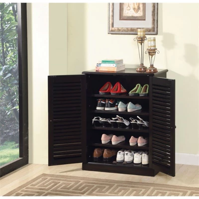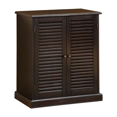 Keep your shoes hidden away and neatly organized within this polished and stylish shoe cabinet. Its five shelves will hold a generous amount of footwear. Louver designed doors create a beautiful, sophisticated front for the transitional styled cabinet, which is crafted from solid wood and wood veneers with a stately espresso finish.Features : Includes: One (1) Shoe CabinetStyle: TransitionalFinish: EspressoMaterials: Solid Wood, Wood Veneer, MDFFive (5) spacious adjustable shelves to store a variety of shoesAdjustable features allows customization of storing smaller or larger footwearLouvre designed doors to add some privacy and allows air flowEasy to follow step by step assembly guide includedSpecifications : Product Dimensions : 30″W x 15″D x 34.5″HProduct Weight : 67 lbsWeight Capacity : 50 lbsAssembly Required : YesWarranty Description : 90-Day Manufacture Limited Replacement Parts Warranty