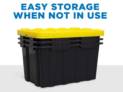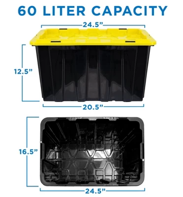 This pack of 3 heavy-duty storage bins each has a storage capacity of 60 liters, or 15.8 gallons. Built to withstand heavy use, these stackable storage crates are designed to improve organization in any space. The lids snap tight for a more secure fit, ensuring the outside elements stay out and your goods stay safe. Great for a variety of uses, including camping, tools, equipment, clothes, personal items and more!