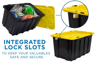 - Rugged utility container with snap tight lid and an opening for an optional padlock