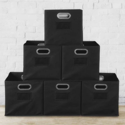 Find your Niche with versatile and modern Niche Fabric Storage Bins! Strong and durable, these bins each include a reinforced bottom panel that adds an extra layer of stability. With the bottom panel in place, they are sturdy enough to use on their own to hold files, scrapbook paper, children’s toys, towels, craft supplies and more. The bottom panel comes out and the entire bin folds flat for easy storage when not in use. Folded bins even fit perfectly inside an open one! Chrome handles are built into two sides of the bin, which makes carrying and moving it easy and worry-free. Inset handles are stronger than sewn-on cloth handles and won’t come unstitched or separate at the seams like cloth handles could. Measuring 12 x 12 x 12, Niche Fabric Bins are truly square and integrate seamlessly into Niche Cubo storage cubes. They can be used in any direction- there is no “right” side to face front because all sides measure the same! Personalize your bins by using the clear label holder on one side. Quickly and easily identify contents or assign bins to individual students. Ideal for every room in the house, make this set of 6 Black Niche Folding Fabric Bins a part of your home or office today!