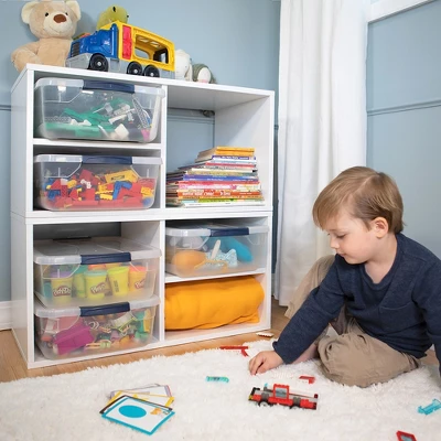 When clutter threatens to take over your space, reign it in with help from the Rubbermaid Cleverstore Bundle with 4 Each 41 Qt & 95 Qt Latching Storage Bins These clear storage bin makes it easy to organize your things and see exactly where they are.(4) 41-quart capacity and (4) 95-quart capacity bins are included in this bundle. With a shallow 6-inch height, this storage container is great for storing small items. Papers, art supplies, kitchen spices, hats and gloves, toys, office supplies, and more will fit inside the latching tote. You can conveniently see what you stored in the bin thanks to the clear sides and see-through lid. This plastic storage container’s lid makes for both easy transport and convenient storage. By simply snapping the latching lid into place, your valuable items stay safe inside the storage tote. Each plastic storage container comes with a lid for easy transport and convenient storage. Just snap the lid into place and your items stay safe inside the storage tote. The lid is recessed so you can easily stack storage bins in your closet, garage, or storeroom.Keep your items organized with this 4-Pack of Rubbermaid Cleverstore 95-Quart Plastic Storage Containers.