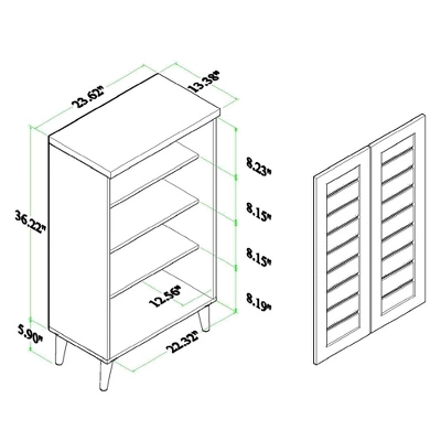 - Four (4) shelves behind the doors provide space for 8 pairs of shoes