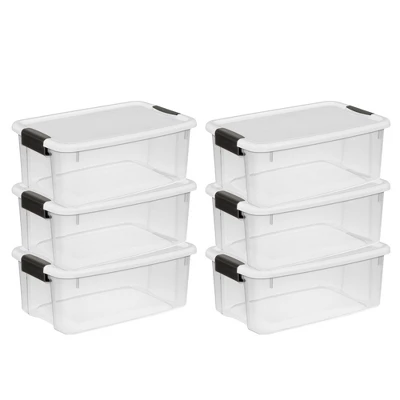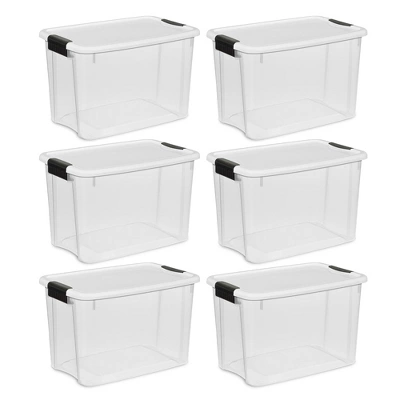 Whether you need to pack away camping gear, blankets, or other bulky items, the Sterilite 30-Quart Latch Storage Box 6-Pack and 18-Quart 6-Pack can help you organize your gear.The 30-quart storage totes are an ideal solution for keepsakes, photographs, important documents, linens, clothing, and other items that need to be stored away and protected. The see through base allows contents to be easily identified, and multiple bases are able to stack on top of each other. This latch storage box is ideal for storing larger items in the basement, garage, and attic.The 18-quart storage totes are great for organizing scarfs, hats, belts, shoes, art supplies, crafting materials, tools, and more. Organize any room in your house, the garage, office, or classroom. The latching lid attaches to the base to ensure your belongings stay safe and secure during a move or while in storage.The Sterilite 30-Quart and 18-Quart clear plastic stackable storage bins with white latch lid package are crafted from durable plastic to keep your possessions protected for the perfect storage solution.