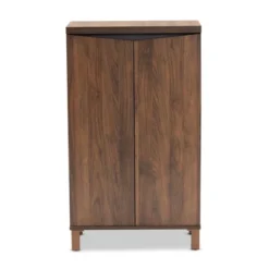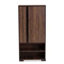 With a compact and stylish design, the Vander shoe cabinet is a convenient upgrade for busy entryways. Made in Malaysia, the Vander features a sturdy wood frame supported by sleek black metal legs. Two open shelves and two additional shelves behind the doors provide space for about eight pairs of shoes, depending on size. Requiring assembly, the Vander features a slatted wood door that enables air circulation and prevents odor buildup. An easy solution to entryway storage, the Vander shoe cabinet accommodates the modern home in superb style.