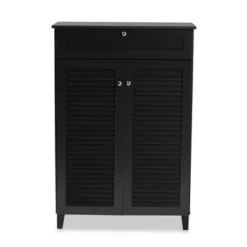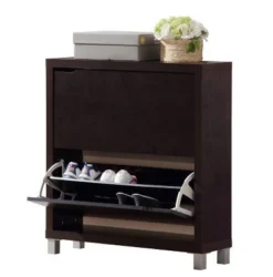 If you’re looking for a simple solution to your storage and organization woes, then the Verdell shoe cabinet is for you. The modern and contemporary-inspired design is unassuming and easy to blend and coordinate with your existing decor. The Verdell is finished in a wenge brown and has silver-finished door handles. The shoe cabinet features four shelves discreetly placed behind two hinged doors with a magnetic closure, which can serve as a shoe rack or other entryway storage. The Verdell also features an open, top storage space with three sides. This shoe cabinet can help keep save space in your mudroom, entryway, and closets. Made in Malaysia, the Verdell requires assembly.