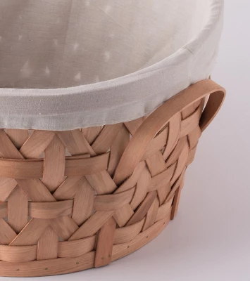 Think fruits, berries, and woodchip baskets on harvest season. Natural woodchip composition and white interior lining makes this basket the perfect place to display and keep fruits in. The white washable lining easily removes making it practical for washing and ensures content protection. Use this country style bucket for apple picking, gift basket, or displaying items.